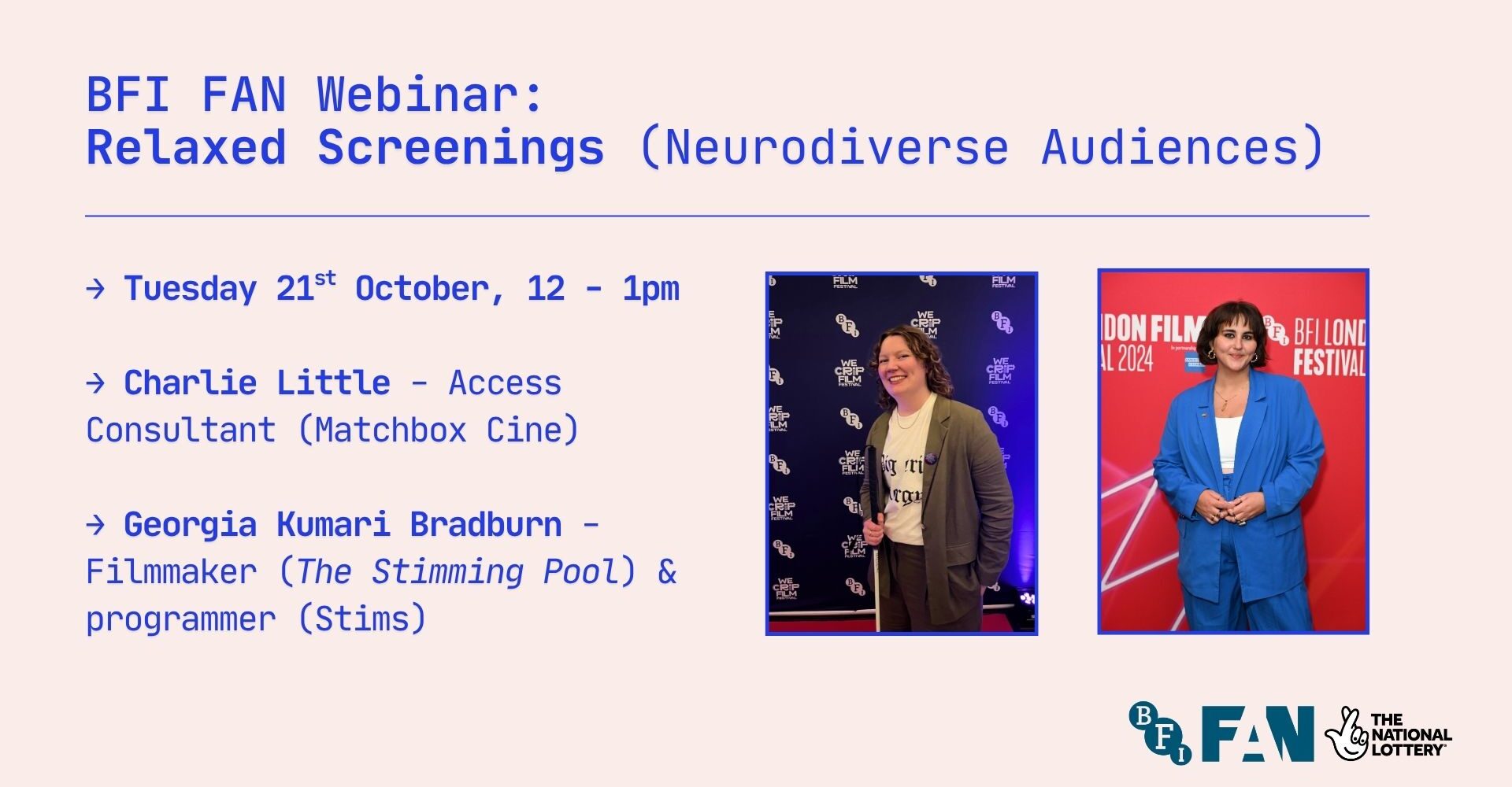 Looking for guidance to create inclusive, accessible screenings for new and existing audiences? Charlie Little (Matchbox Cine & BFI FAN’s EDI Champion) and Georgia Kumari Bradburn (co-director, The Stimming Pool & co-founder, neurodivergent-led curatorial collective Stims) will share best practice, and meaningful engagement techniques, to welcome neurodivergent audiences.