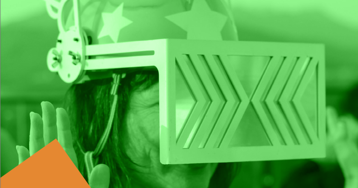 A person wearing a futuristic visor and a helmet adorned with stars and wing-like attachments. The image has a green filter, with orange and blue geometric shapes overlaying, suggesting playfulness and creativity.