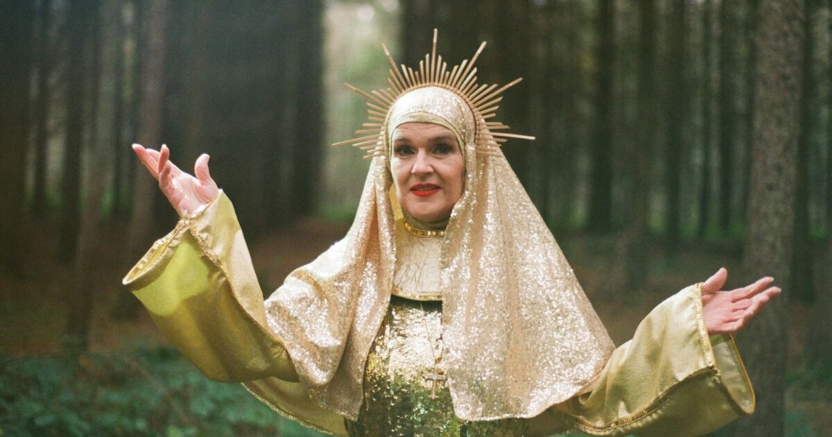 A figure in a golden, shimmering robe with a halo stands in a forest, arms raised and surrounded by tall trees.